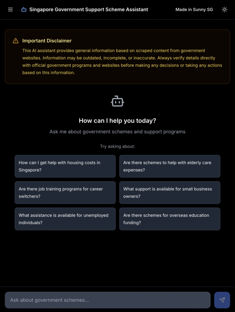 The official SupportGoWhere site is the source of truth for most government support schemes, but it’s a lot to dig through. My tool uses a RAG-based chat assistant that scans that entire site to give you a straight answer, fast. Think of it as turning the whole website into a chatbot you can talk to.