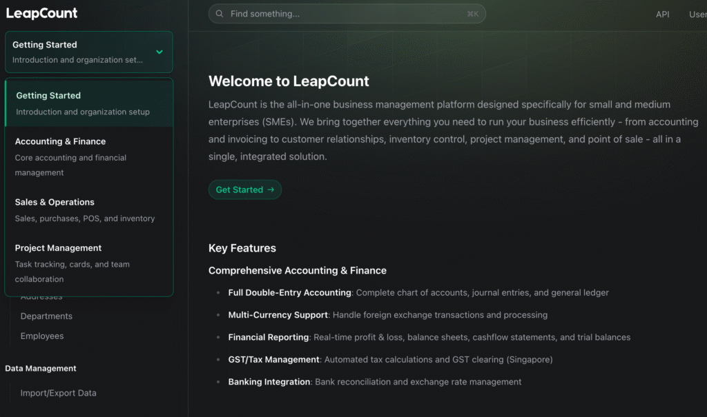 New users now land in the “Getting Started” module by default, with a completely rewritten introduction that positions LeapCount as the comprehensive business solution it has become – not just an accounting tool, but a complete platform combining: