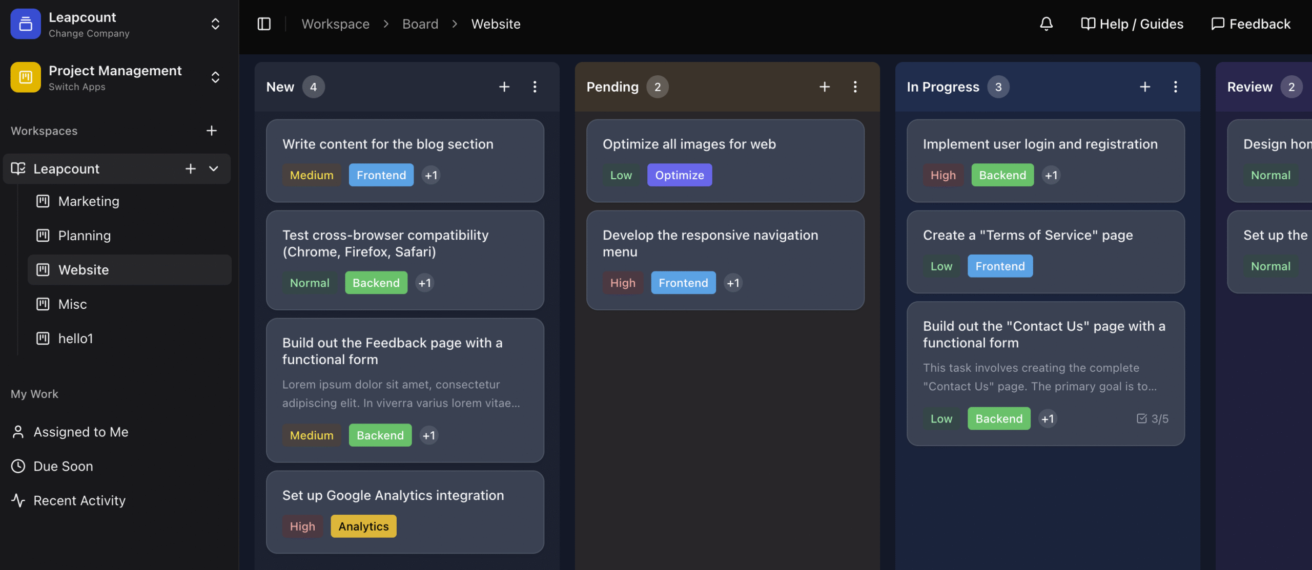 Our Project Management module brings visual, flexible Kanban-style boards directly into Leapcount. But we didn’t just build another task board – we built a system that scales with how your team actually works.
