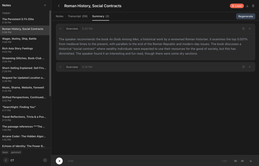 After a meeting ends, you can generate a summary. The app sends your transcript to Ollama, which processes it with whatever local model you have installed. The summary appears in the app. Nothing leaves your machine.