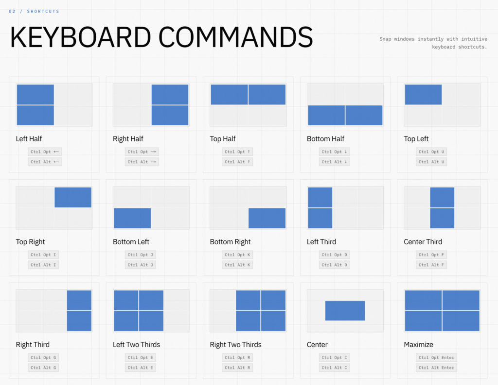 SnapToWindow snaps windows to halves, quarters, thirds, and more using keyboard shortcuts. Ctrl+Alt+Left on Windows, Control+Option+Left on macOS—same logic, same muscle memory.