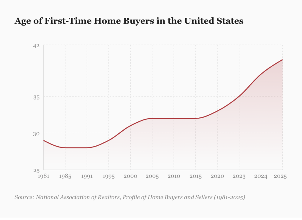 In 2025, the typical first-time homebuyer is 40. They have been out of college for nearly two decades. They are closer to the age when they can collect Social Security than they are to their graduation day.