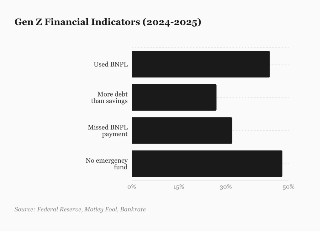 The data shows what giving up looks like. Nearly half of Gen Z—44%—used Buy Now, Pay Later services last year. One in four carries more debt than savings. A third have missed payments. Almost half have no emergency fund at all.