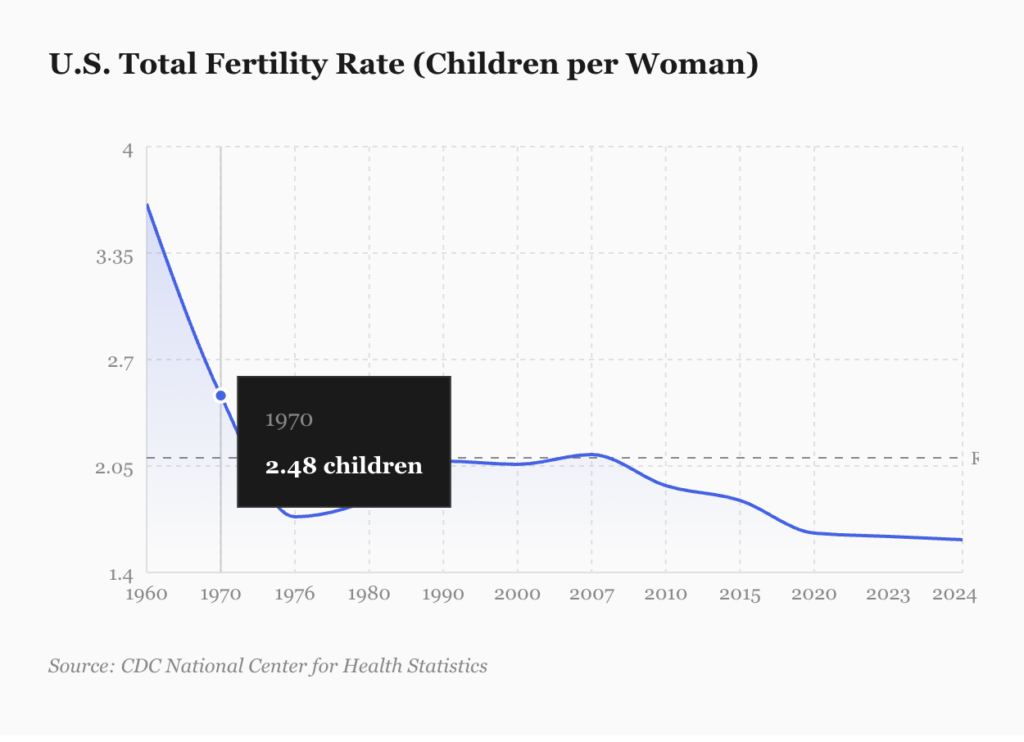 In 2024, the U.S. fertility rate fell to 1.599 children per woman—the lowest in American history. The number needed to maintain population without immigration is 2.1. We have been below that threshold, with brief exceptions, since the early 1970s.