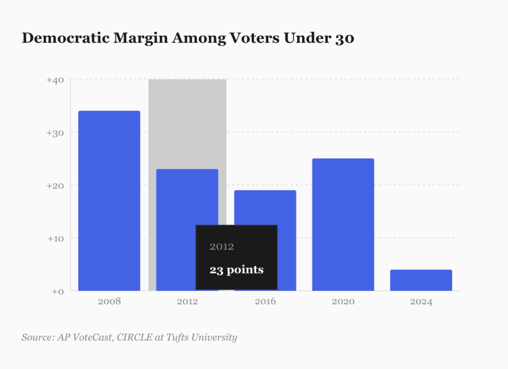 In 2020, voters under 30 favored Joe Biden over Donald Trump by 25 percentage points. In 2024, that margin collapsed to just 4 points for Kamala Harris. It was the strongest showing for a Republican presidential candidate among young voters since 2008.